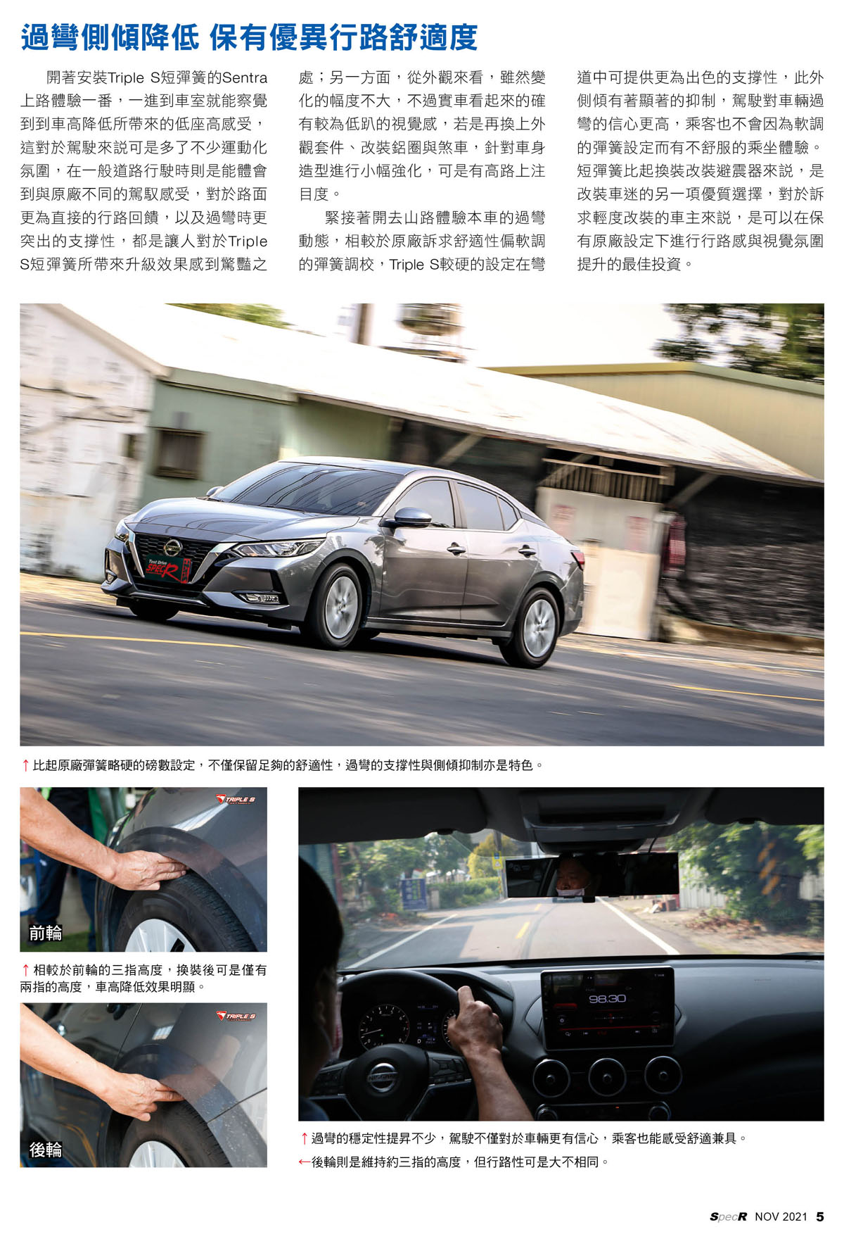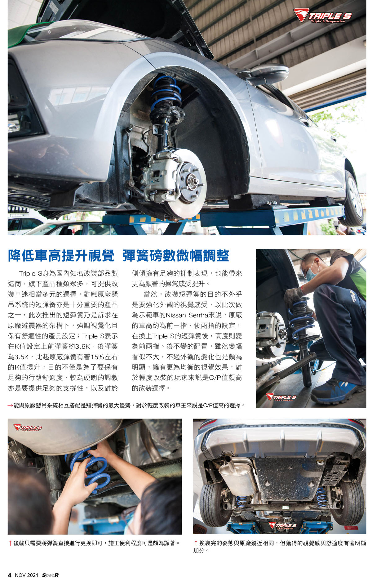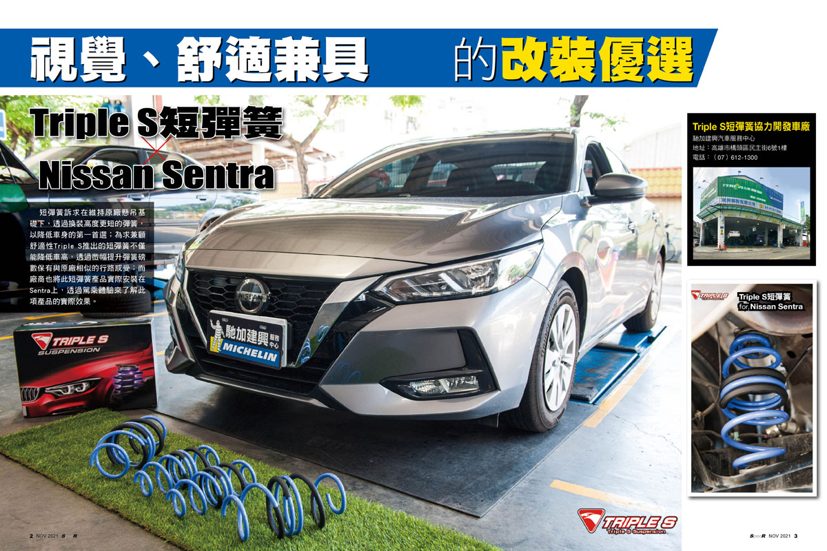 【感謝「SPEC-R汽車性能情報」雜誌報導】Nissan All New Sentra ×Triple S短彈簧:視覺、舒適兼具的改裝優選 短彈簧素求在維持原廠懸吊基礎下,透過換裝高度更短的彈簧,以降低身車的第一首選;為求兼顧舒適性Triple S推出的短彈簧不僅能降低車高,透過微幅提供彈簧磅數保有與原廠相似的行路感受,而廠商也將此短彈簧產品實際安裝在Sentra上,透過駕乘體驗來了解此項產品的實際效果。: (詳細內文刊載於「SPEC-R汽車性能情報」第289期/2021年11月號) 感謝協力開發車廠 : 馳加建興汽車服務中心 感謝 SPEC-R 特別報導