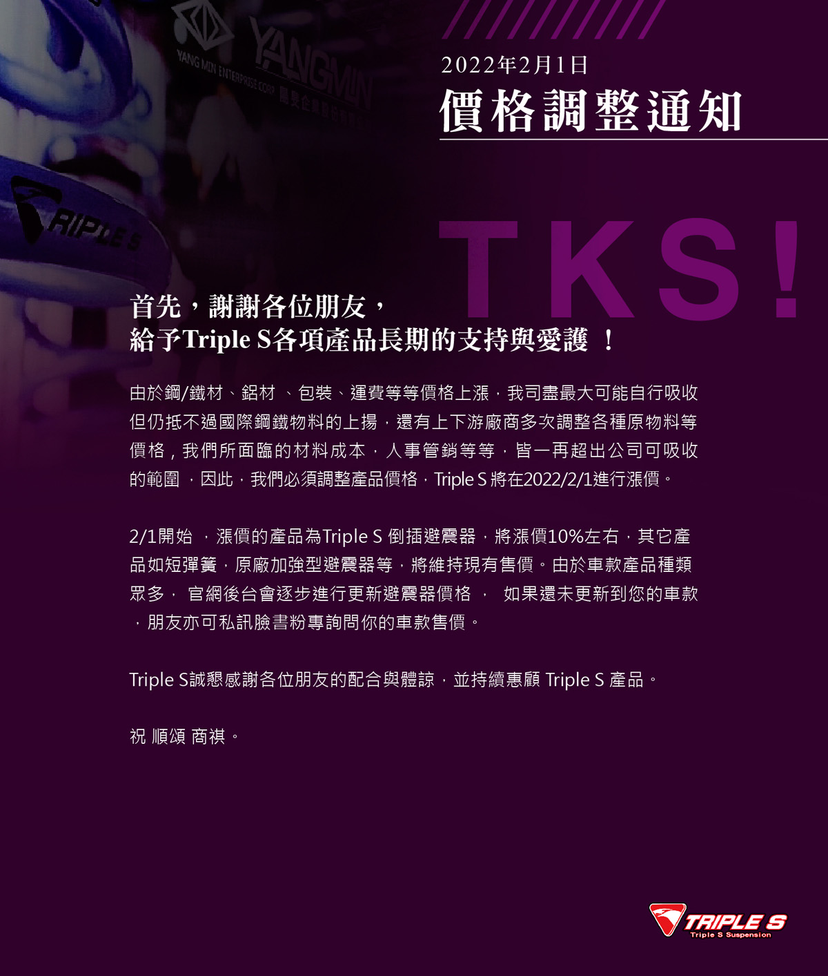 Triple S 將於 2022/2/1 起調漲產品售價